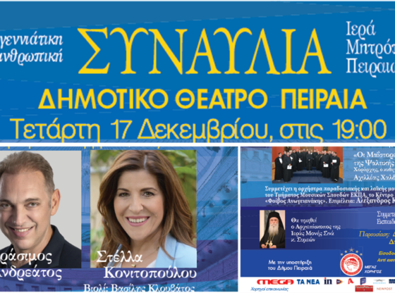 Με τη συμμετοχή του Γεράσιμου Ανδρεάτου και της Στέλλας Κονιτοπούλου θα πραγματοποιηθεί την Τετάρτη 17 Δεκεμβρίου 2025 στις 19:00, η μεγάλη Χριστουγεννιάτικη Φιλανθρωπική Συναυλία της Ιεράς Μητροπόλεως Πειραιώς στο Δημοτικό Θέατρο της πόλης, με την υποστήριξη…