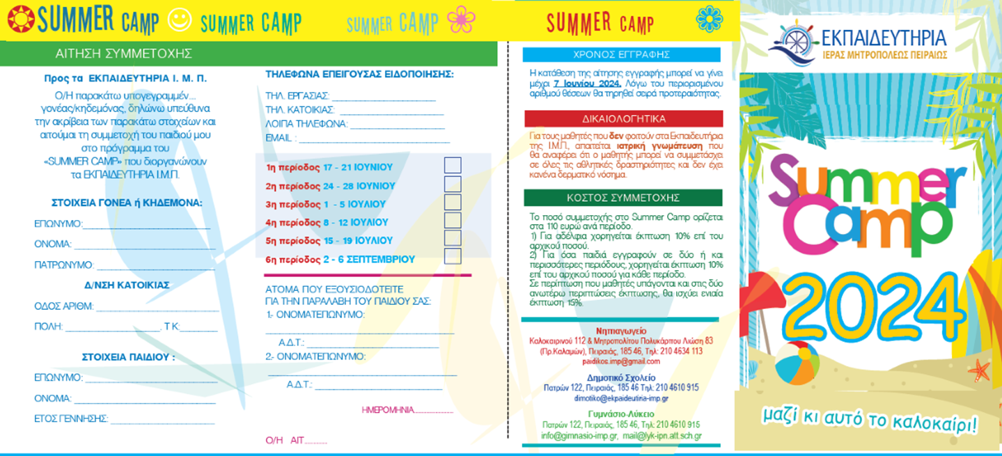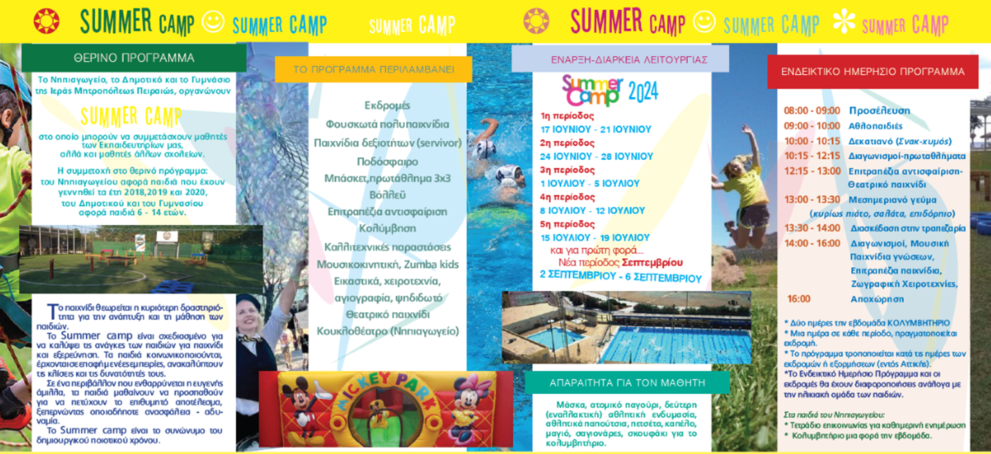 Στα Summer Camp των Εκπαιδευτηρίων της Ιεράς Μητροπόλεως Πειραιώς, η διασκέδαση, οι όμορφες παρέες και τα πολλά χαμόγελα στις υπερσύγχρονες εγκαταστάσεις μας, προσφέρουν ασφάλεια, ενώ το επιστημονικό και παιδαγωγικό προσωπικό, το οποίο είναι εξειδικευμένο στις αθλοπαιδιές, αποτελεί εγγύηση για το επιθυμητό αποτέλεσμα.