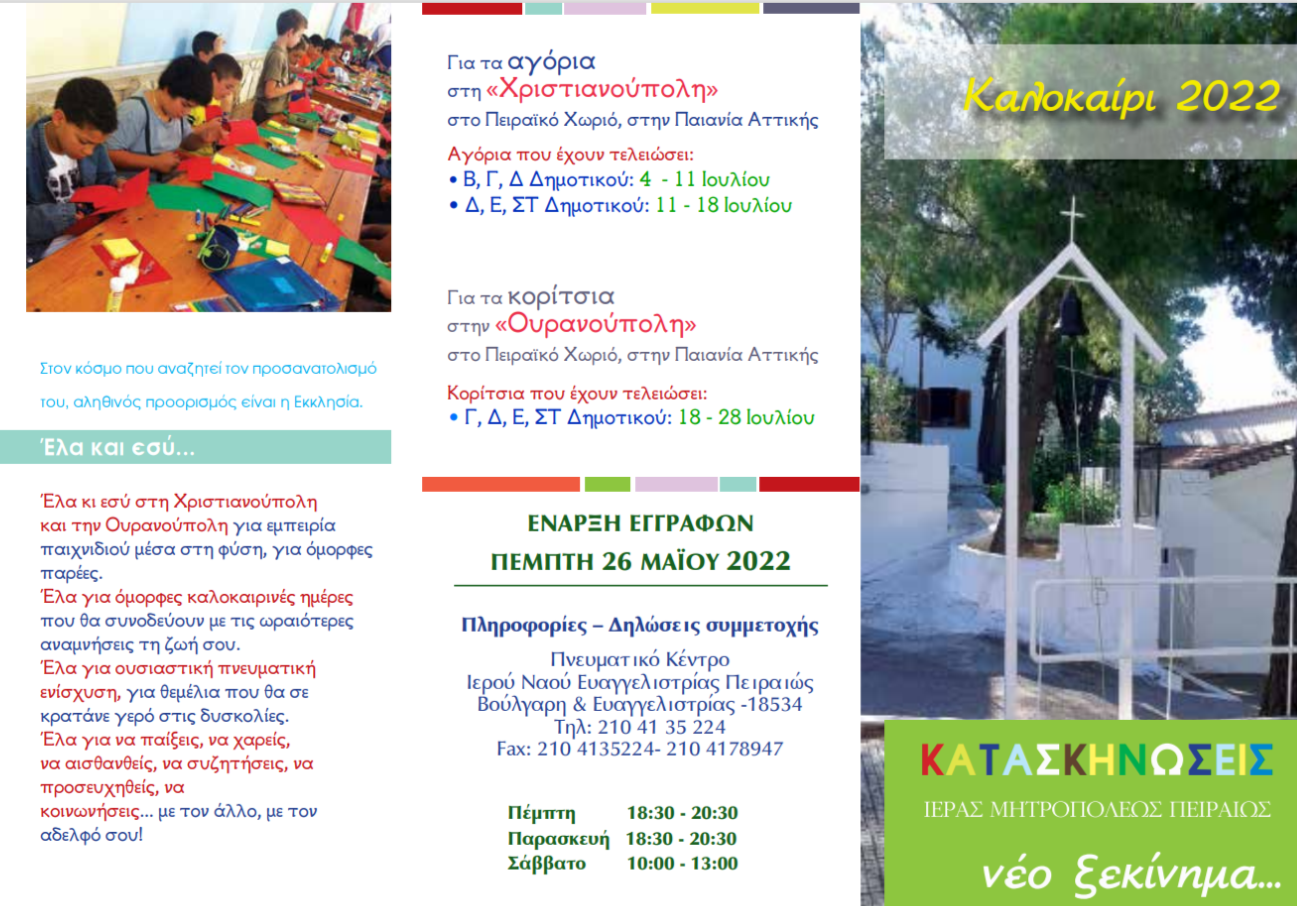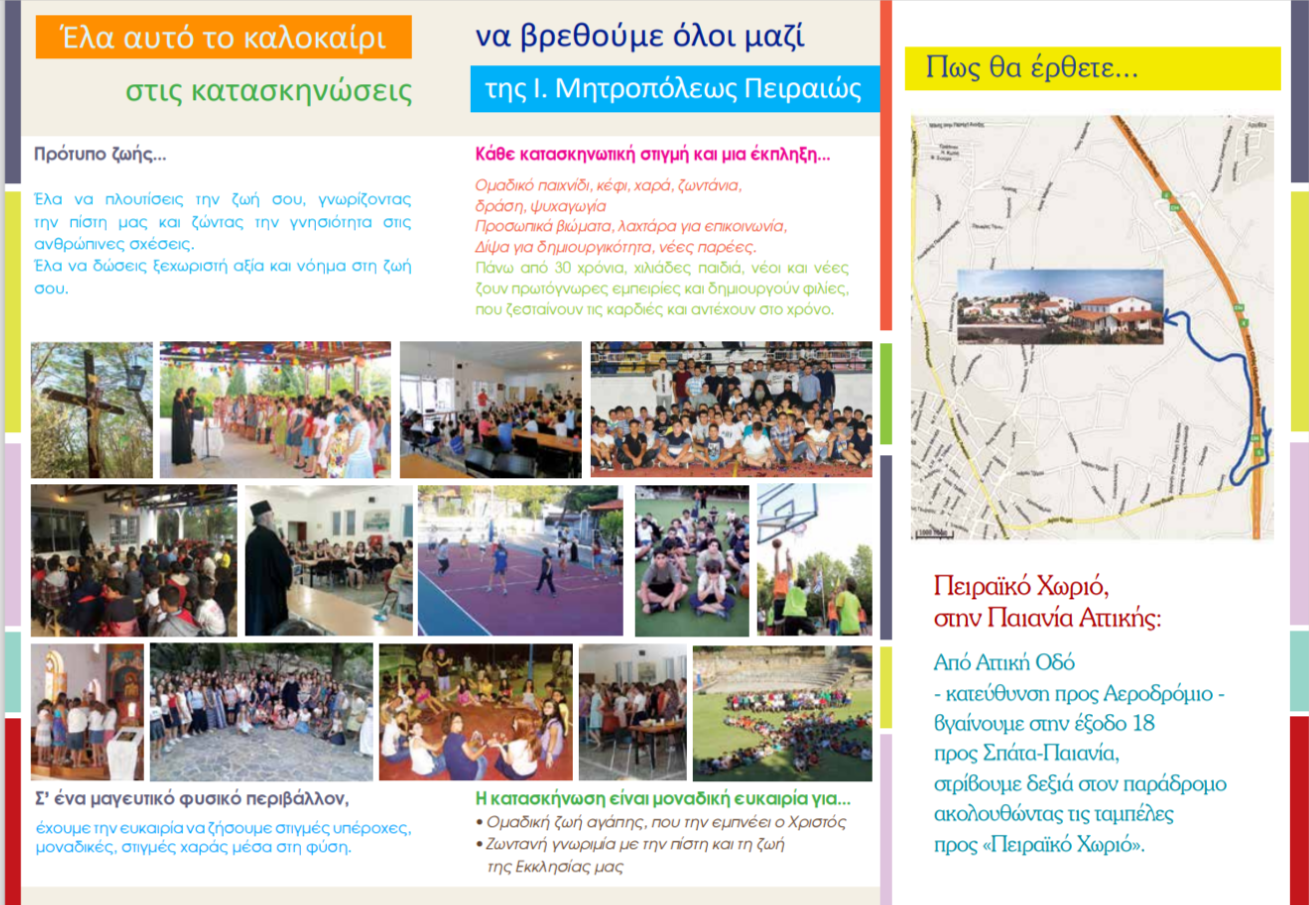 Την ευκαιρία να βιώσουν την ομορφιά της χριστιανικής ζωής, να κοινωνικοποιηθούν και να διαμορφώσουν ώριμη και καλλιεργημένη προσωπικότητα με αρετές και αξίες θα έχουν τα παιδιά, οι νέοι και οι νέες που θα συμμετάσχουν στις κατασκηνώσεις της Ιεράς Μητροπόλεως Πειραιώς οι οποίες θα λειτουργήσουν φέτος κανονικά στις ανακαινισμένες εγκαταστάσεις της τοπικής μας Εκκλησίας στην Παιανία Αττικής.