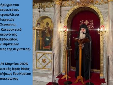 Ο Κατανυκτικός Εσπερινός της E΄ Εβδομάδος των Νηστειών στην Ιερά Μητρόπολη Πειραιώς – Το κήρυγμα του Σεβασμιωτάτου.