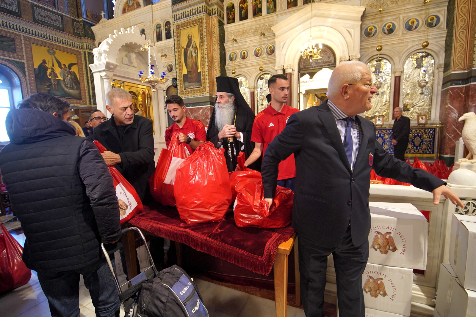 Αμέσως μετά, ο κ. Βασίλης Βασιλειάδης, εκπροσωπώντας τον Πρόεδρο του Ολυμπιακού κ. Ευάγγελο Μαρινάκη, πρόσφερε στον Σεβασμιώτατο επιταγές που καλύπτουν τη μηνιαία μισθοδοσία τεσσάρων κληρικών της τοπικής μας Εκκλησίας, οι οποίοι δεν μισθοδοτούνται από το κράτος.